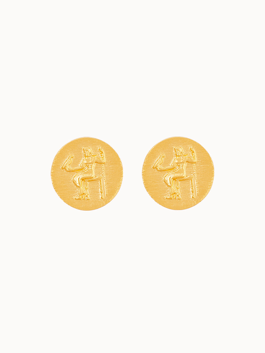O Brinco Deus Grego M, da coleção Al Mar, é feito em ouro 18k fosqueado e traz um design autoral em formato redondo, inspirado na imponência da mitologia; um clássico que une força e sofisticação em cada traço.