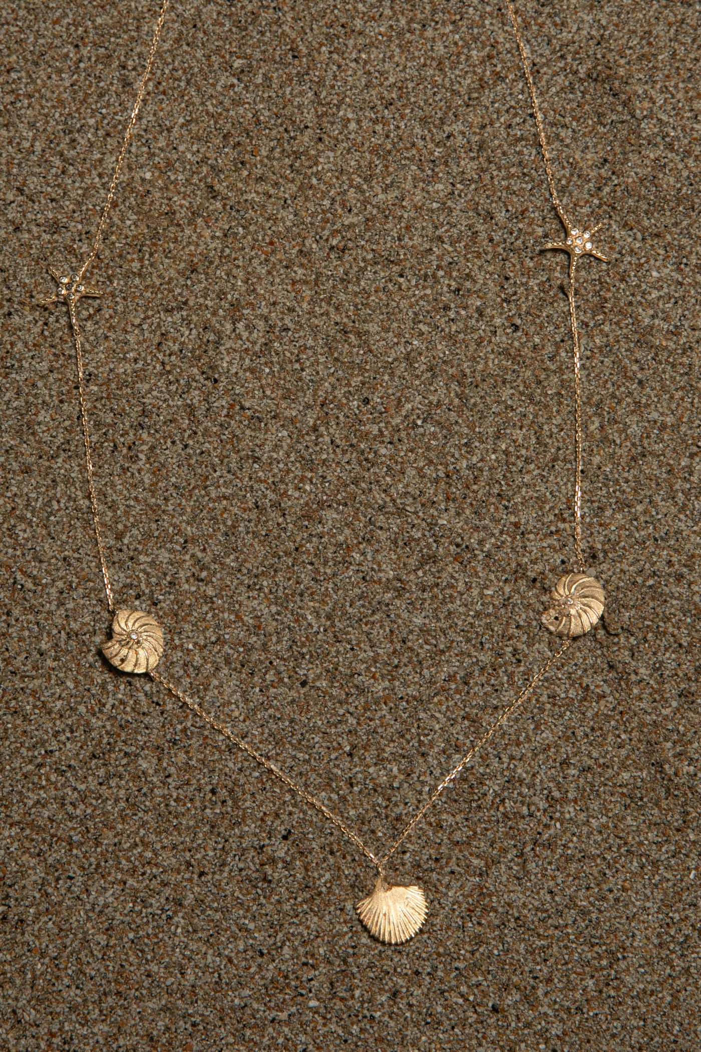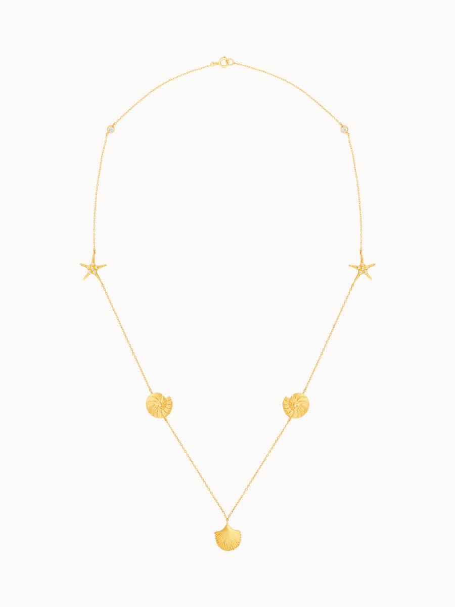 O Colar Al Mar Trio, em ouro 18k com diamantes, reúne a estrela do mar, a concha e o caracol em um design autoral que traduz a beleza e a riqueza do Mediterrâneo; um tesouro para acompanhar você em qualquer lugar.