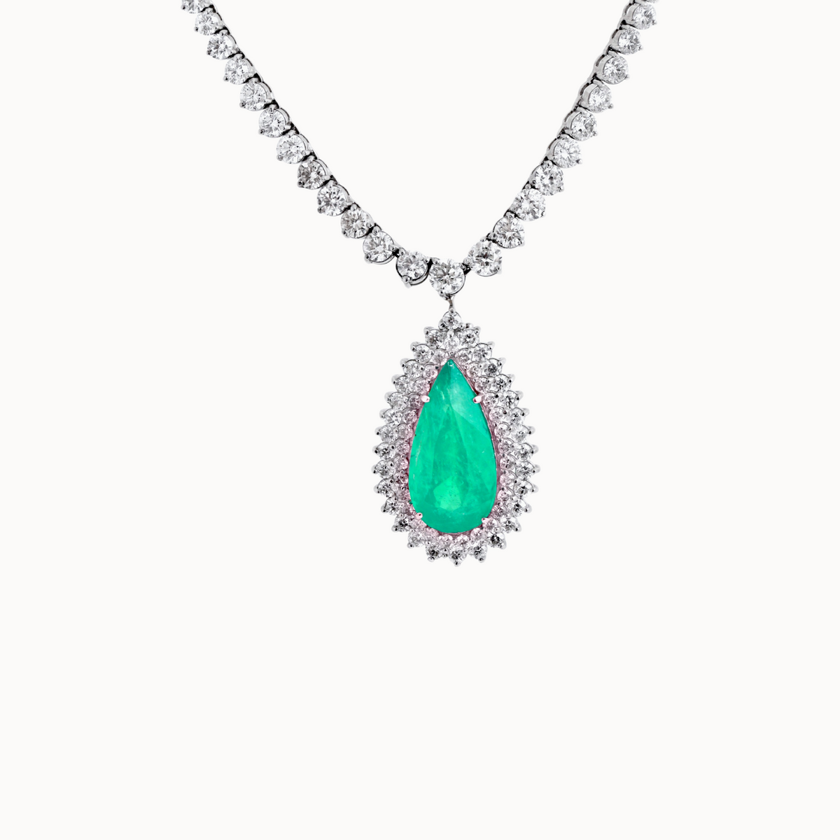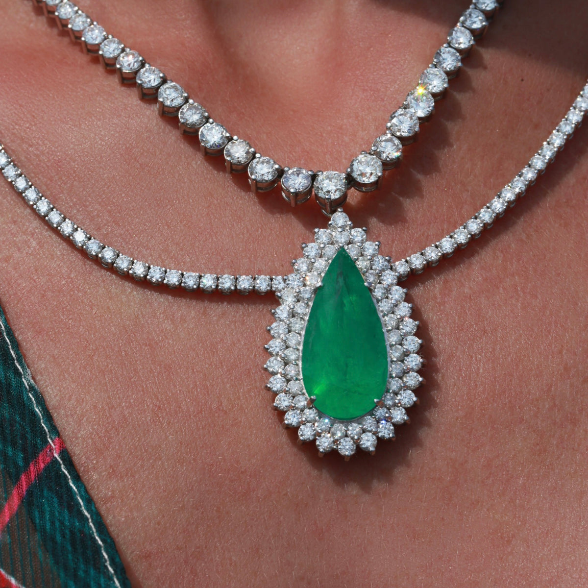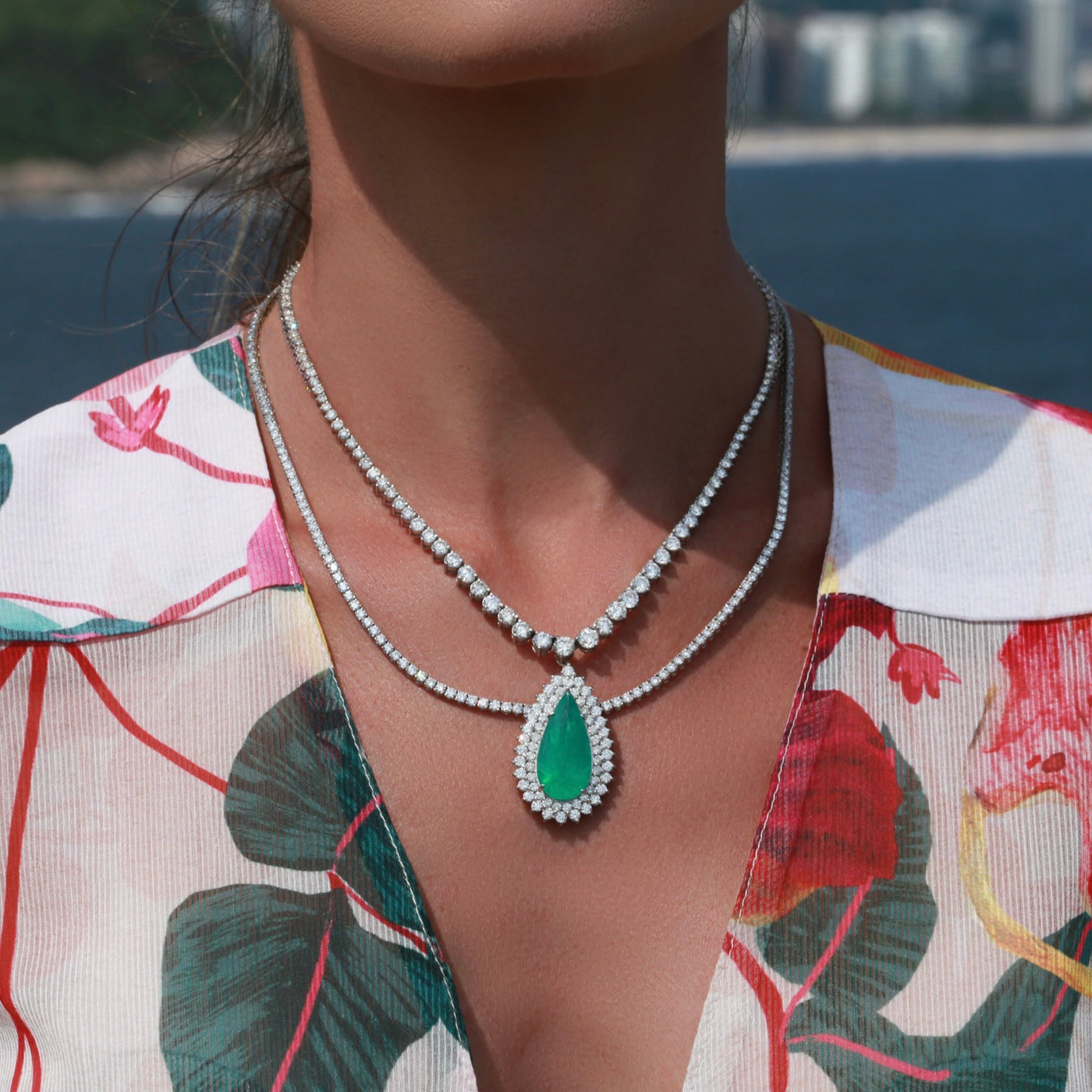 A esmeralda central, lapidação gota, é emoldurada por diamantes que realçam sua cor intensa e transformam a peça em uma verdadeira joia-rainha.