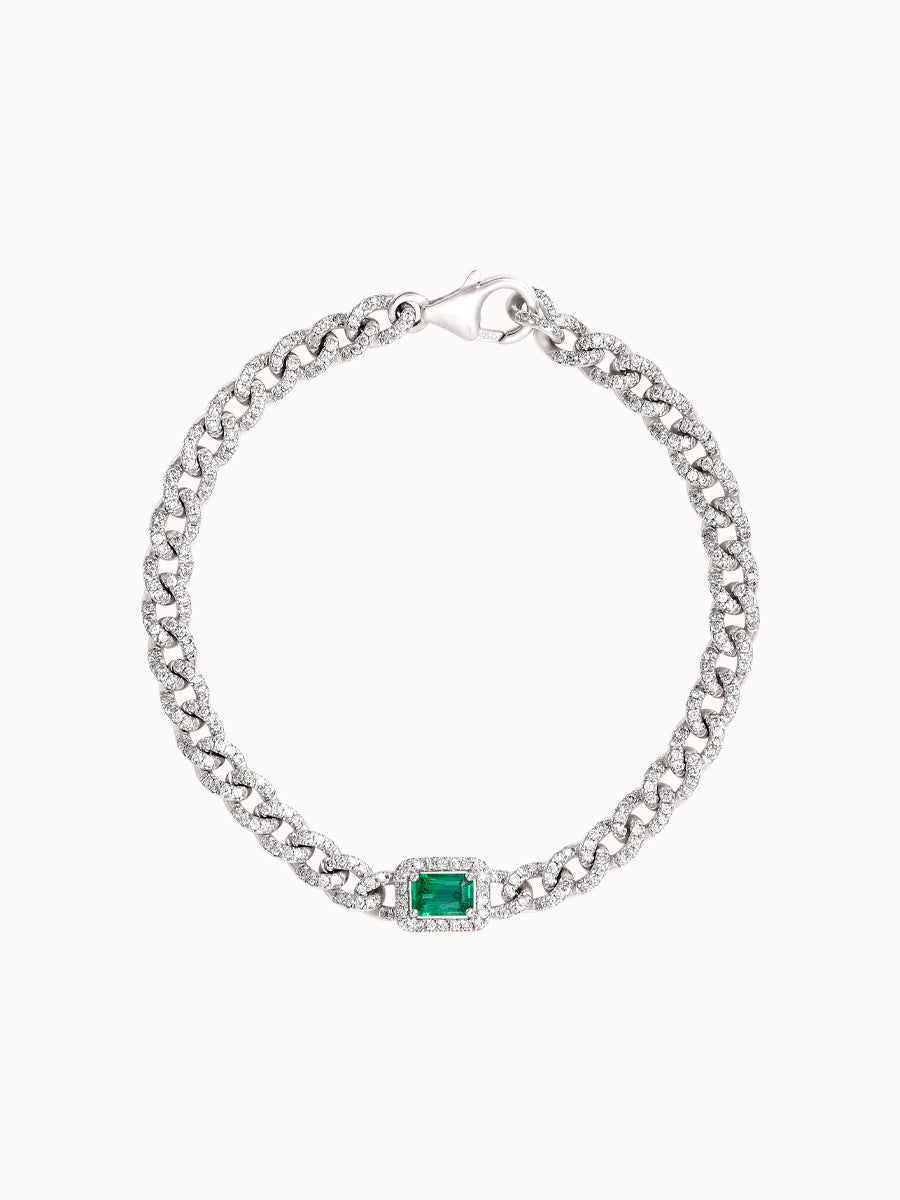 O Bracelete Emerald Chain une a força da corrente cravejada em Diamantes ao brilho intenso da Esmeralda; uma peça marcante, moderna e absolutamente exclusiva.